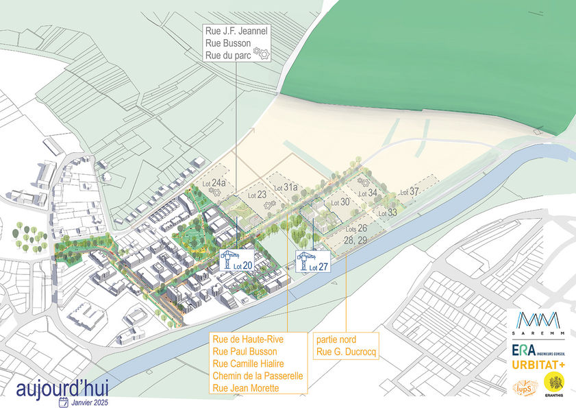 Équipe : Urbitat+ mandataire(urbanisme et architecture) IUPS (Paysage) , Eranthis (expertise Ecoquartier et génie végétal), ERA (Ingénierie VRD et hydraulique, OPCU)